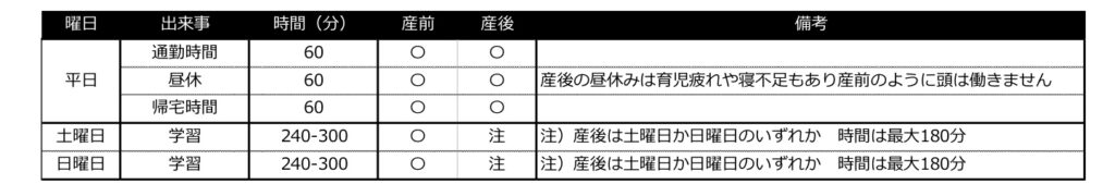 曜日問わず、朝5時頃起床、6時半まで学習、夜は0時から1時頃まで学習していました。睡魔が半端ないですが、二度とこんな試験受けたくない、という一心でやっていました。育児が伴うと妻も不機嫌になりますし、肩身が狭いので、一刻も早くこの状況を脱出したいという思いでやっていました。