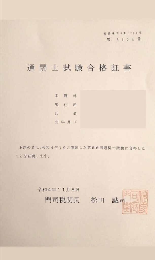 1回目の受験と全く正反対の状況ですが、自己採点は通関業法34/45、関税法36/60、実務29/45という結果でした。猛烈な追い上げを図るウサギに対し、最初から最後までスローペースを貫きながらも何とかギリギリ逃げ切って勝利したカメのような奇跡の合格だと思います。1点分のマークミスすら許されない状況だったため、合格発表当日までの毎日が本当に不安ばかりでしたが、発表当日に税関HPで自分の受験番号を見つけたときは安心感と喜びが一気に込み上げてきました。