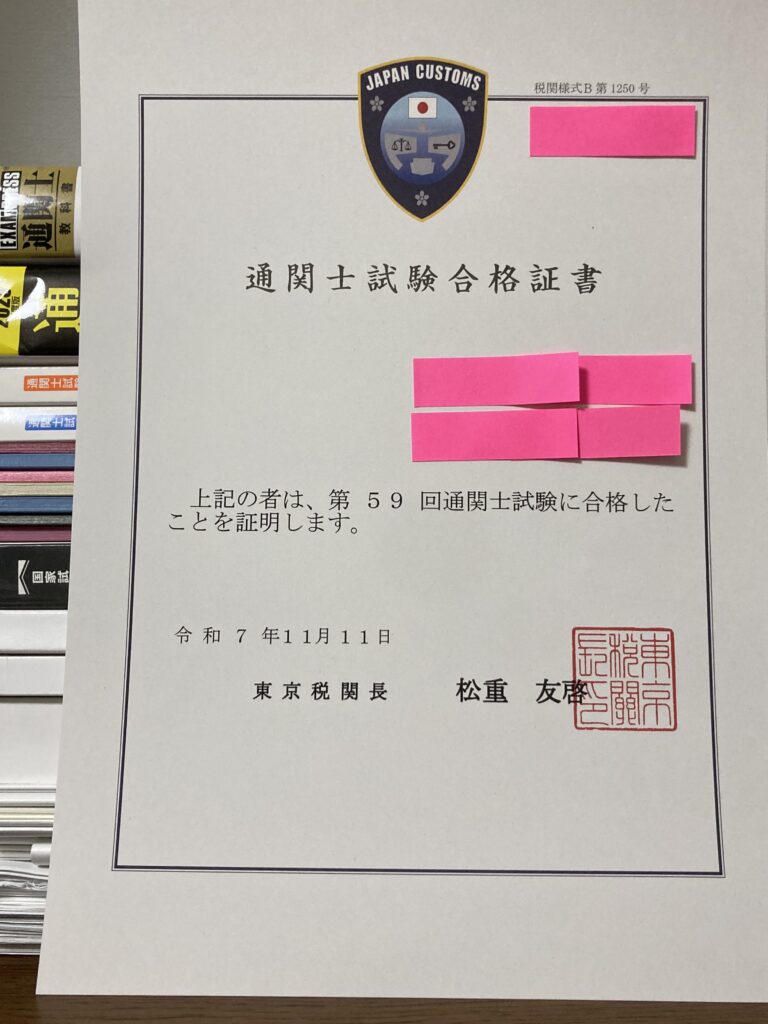 緊張のあまり寝られず、睡眠時間2時間という最悪のコンディションで受けました。通関実務の時に寝不足の影響か不整脈が起きて、途中からまともな状態ではなかったので、合格発表までマークミスの可能性に怯えていました……。